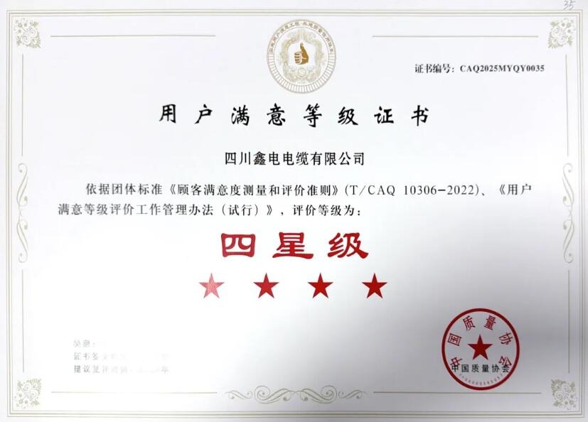 近日,四川鑫电电缆有限公司凭借在经营管理、产品品质及服务体系等方面的综合优势,成功获得中国质量协会颁发的 “用户满意四星级企业”,“鑫电牌” 电线电缆同步获评 “用户满意四星级产品”,双项荣誉的获得,是国家权威机构对鑫电电缆深耕线缆行业高质量发展的高度认可。