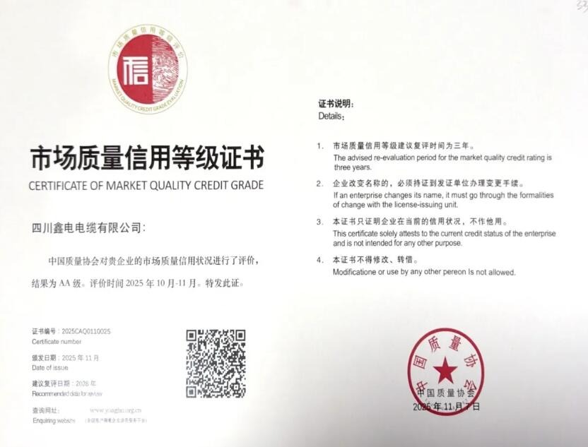 近日,四川鑫电电缆有限公司凭借在质量诚信建设、品质保障能力及合规经营等方面的突出表现,成功荣获中国质量协会颁发的 “市场质量信用 AA 级企业”(最高等级AAA) 殊荣,成为线缆行业质量诚信建设的标杆之一!